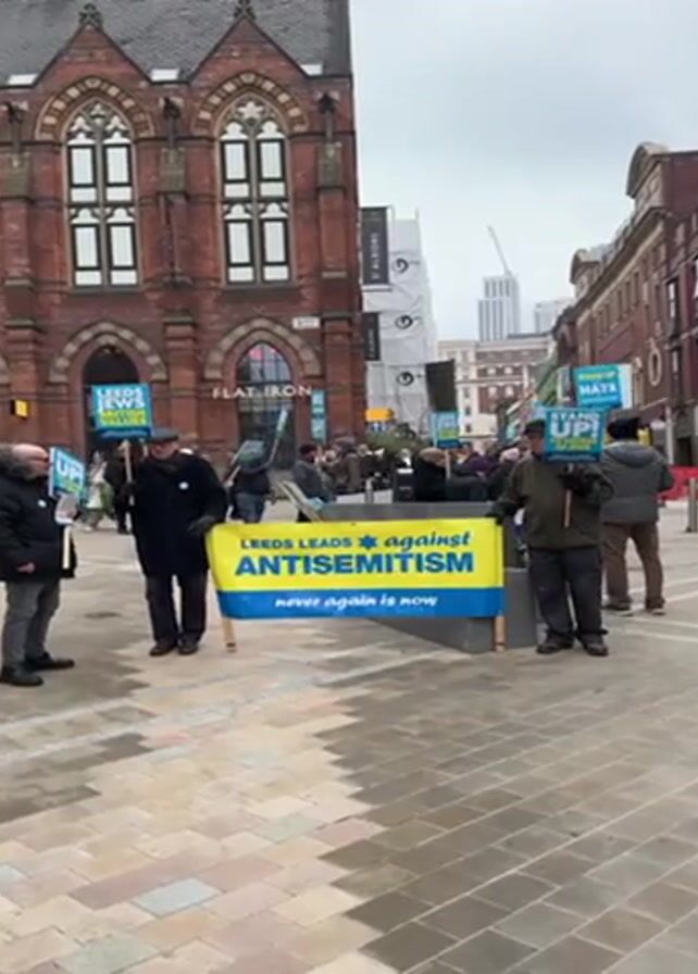 group of people gathered in a city square holding signs and a banner. The banner reads "LEEDS LEADS against ANTISEMITISM. Never again is now". Some individuals hold smaller signs saying "LEEDS LEADS" and "HATE STAND UP!". They appear to be protesting or demonstrating against antisemitism. The background features a brick building with multiple windows, construction work on a building, and other buildings in the distance. The square is paved with patterned stones. The weather seems overcast.