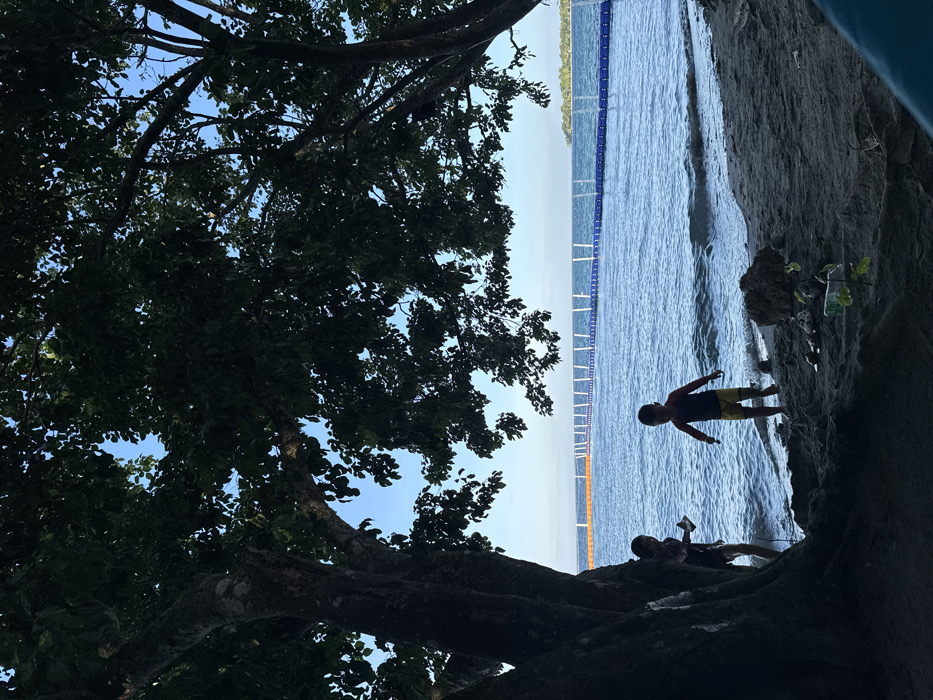 The image depicts a coastal scene in Mampising, Philippines, characterized by a shoreline and open water under a clear blue sky. In the foreground, two large trees with dense, dark green foliage cast significant shadows over the sandy beach, creating a strong silhouette effect. Two children are present on the beach. On the left, a child is partially obscured by a tree trunk, with only their upper body and head visible, appearing to hold a light-colored object. To their right, a second child, dressed in a long-sleeved dark top and yellow shorts, stands at the water's edge, facing away from the viewer, with their feet partially submerged or close to the small waves. The water extends into the mid-ground, where a lengthy, segmented floating structure is visible. This structure consists of alternating blue and orange/yellow modular sections, stretching horizontally across the bay. In the distance, a landmass or island is visible on the right horizon under the bright sky. The overall lighting suggests a sunny day, with the foreground shaded and the background brightly illuminated.