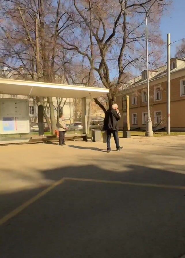 The camera shows a city square on a sunny day, with bare trees and buildings as a backdrop