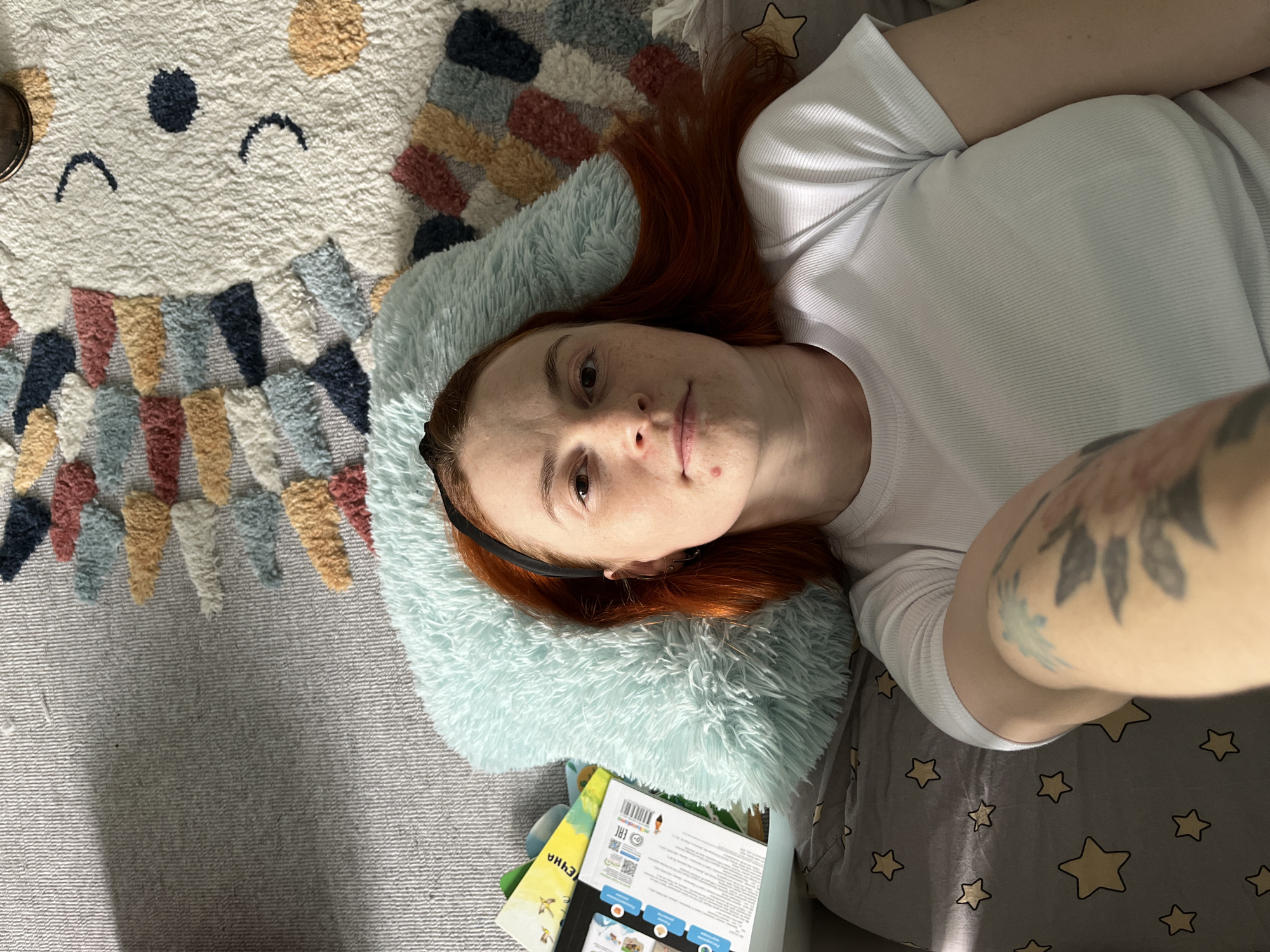 A woman with red hair and fair skin lies on a bed with gray star-patterned bedding and a blue, fluffy pillow. She wears a white t-shirt and a black headband. Her left arm is visible, featuring a tattoo. The background includes a rug with colorful patterns and a stack of books and boxes near the pillow. The location is identified as Chaikovsky, Russia.