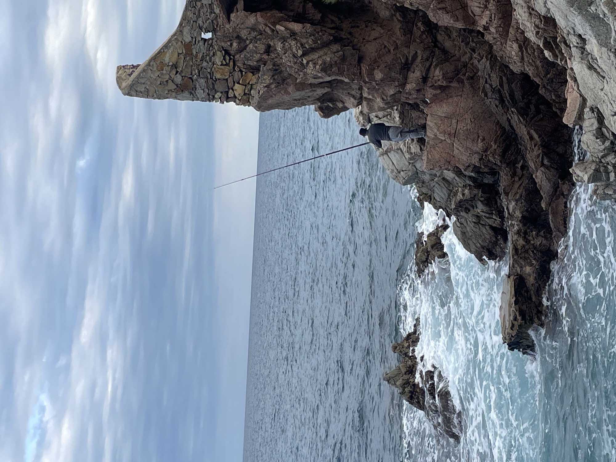 A coastal scene in Lloret de Mar, Spain, displays a lone individual engaged in fishing from rugged cliffs under an overcast sky. The prominent stone wall on the right, built into the cliff, identifies the location as adjacent to the Castell d'en Plaja. The person, viewed from behind, wears a dark long-sleeved garment, light grey trousers, and a dark hat. They stand on a reddish-brown rock ledge, actively holding a long, dark fishing rod extending over the dark blue-grey sea. Waves generate white foam as they break against the numerous exposed and submerged rocks. The sky is uniformly covered with light grey stratocumulus clouds.