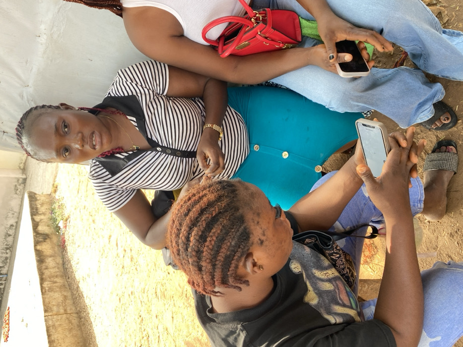 Three women are seated. One wears a striped shirt, a blue dress, and has braided hair. The second wears a white tank top and jeans. A red handbag is on her lap. She is holding a phone. The third woman has brown braids, a black t-shirt and jeans. She is also holding a cell phone. The background appears to be outdoors, with dirt and a concrete wall visible.