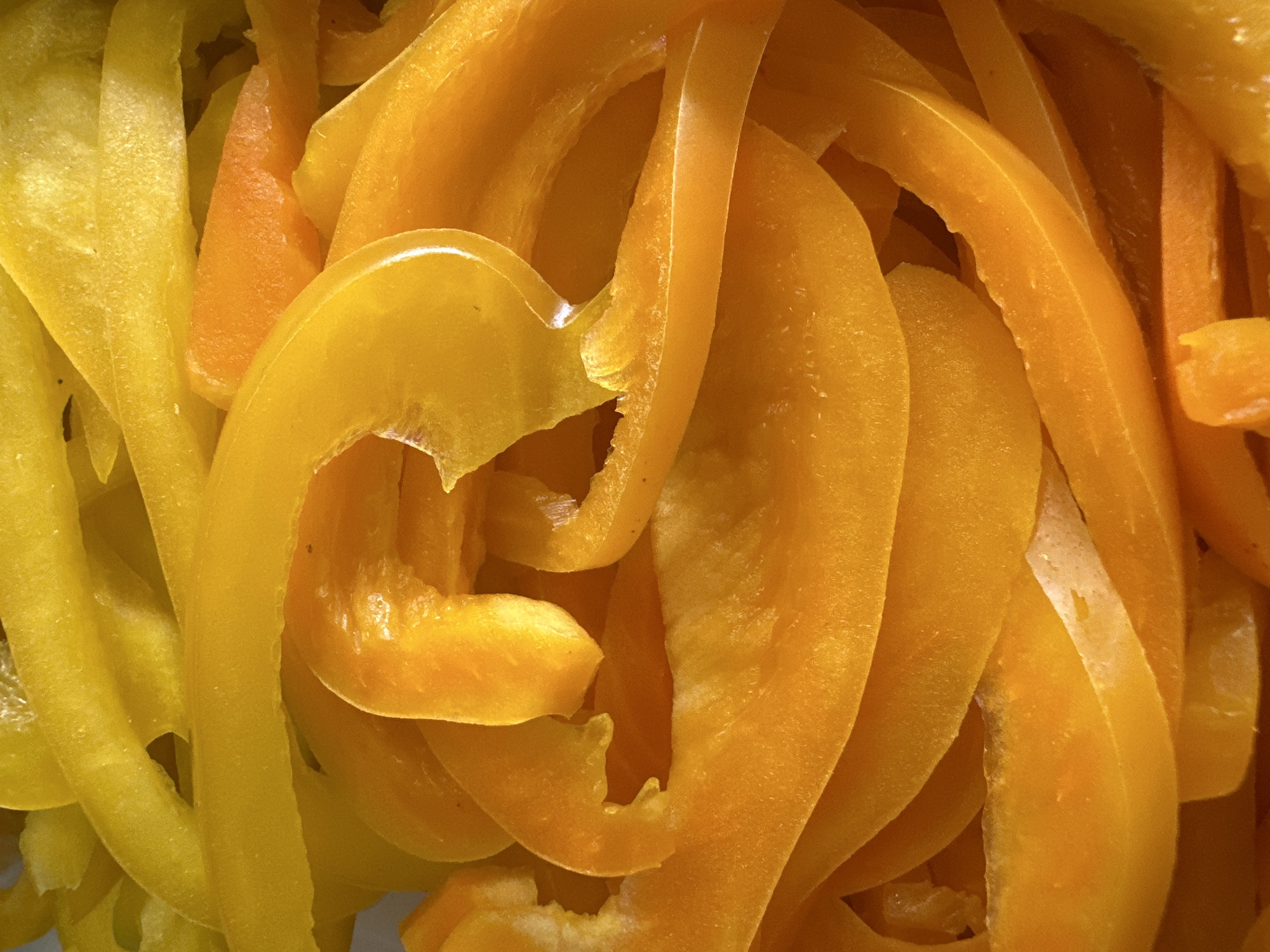 close-up of sliced yellow and orange bell peppers