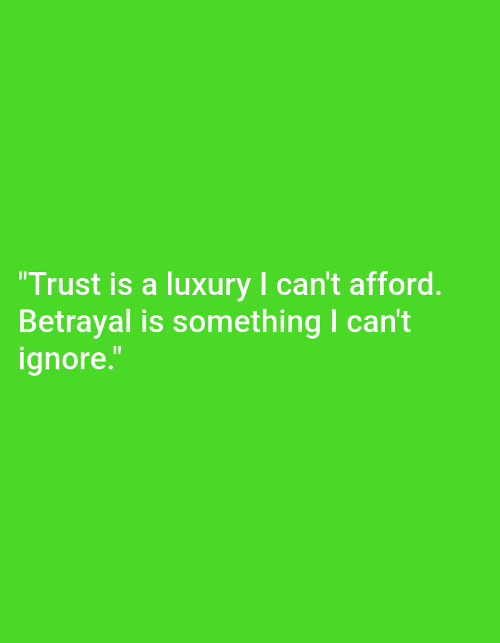 A solid green background features a stark quote in white text. The text reads, "Trust is a luxury I can't afford. Betrayal is something I can't ignore." The message evokes feelings of vulnerability and a guarded stance towards relationships and potential threats. The simple design with a plain background emphasizes the quote's message.