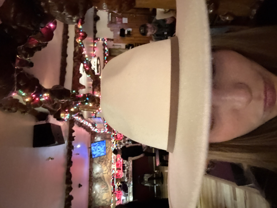 A woman wearing a large white cowboy hat dominates the frame. Behind her, a restaurant interior is visible, decorated with Christmas lights along the walls and archways. A television screen glows blue amidst the decorations. Other patrons can be seen at the bar in the background.