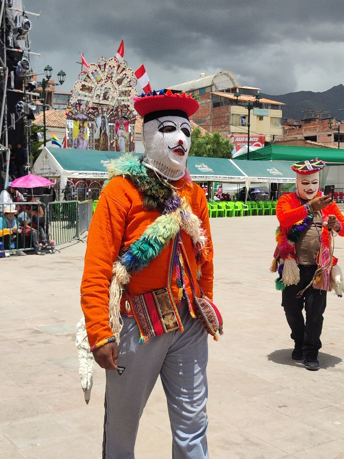 Two people are dressed in vibrant, traditional Peruvian festival costumes. The foreground figure wears a white mask with exaggerated features, a red hat, an orange jacket, a colorful sash, and grey sweatpants. The background figure is similarly dressed but holds a smartphone. They stand on a concrete square. Behind them are buildings, tents, and what looks like a celebratory structure. The sky is overcast, indicating possibly a cloudy or rainy day.