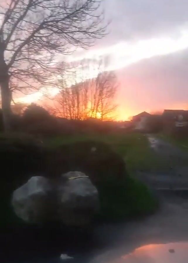 view from a car looking out onto a park or green space at dusk or dawn. Two large rocks are visible in the foreground. Beyond them is a raised area of grass and shrubs. Bare trees are silhouetted against a colorful sky that is orange and pink near the horizon, transitioning to grey clouds above. In the distance, several houses are visible. A wet road or path leads towards the houses. The car's hood and windshield reflect the colors of the sky. The camera pans slightly from left to right.