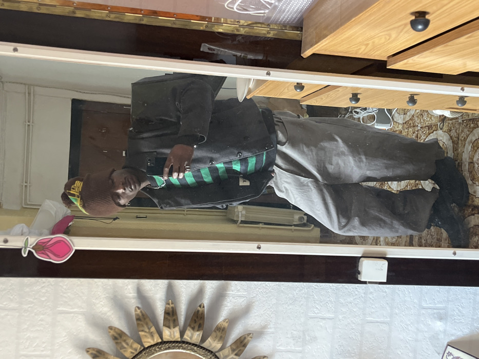 An adult male with dark skin is depicted in a full-length mirror selfie, positioned indoors within a residential dwelling in Barcelona, Spain