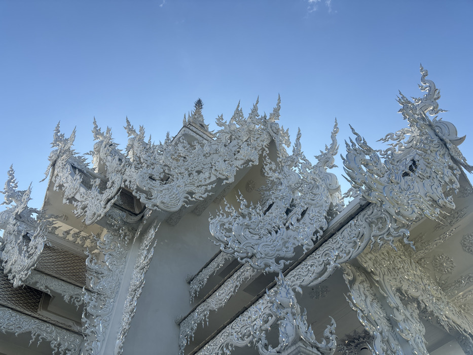 A low-angle photograph captures an ornate section of the Wat Rong Khun (White Temple) located in Ban Rong Khun, Thailand