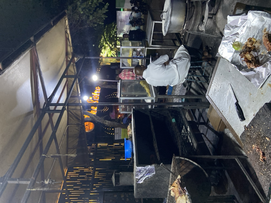 n outdoor food stall in Dodoma, Tanzania, located at the coordinates -6.157 latitude and 35.723 longitude. The stall is situated under a canopy, with a sign that reads "The Bistro" illuminated with warm yellow light. A man in a white shirt sits on a stool facing away from the camera, with his back to the viewer. The stall appears to be a barbecue restaurant with a large metal grill, where food is being cooked over an open flame. There are other food stalls nearby, selling snacks and drinks. The image captures a dimly lit night scene, with the light from the stalls illuminating the space. The ground is uneven, with a mixture of pavement and dirt. A large metal pot sits on a stand in the foreground, with a small knife resting on the table. A plate covered in foil holds food, likely prepared for a customer.