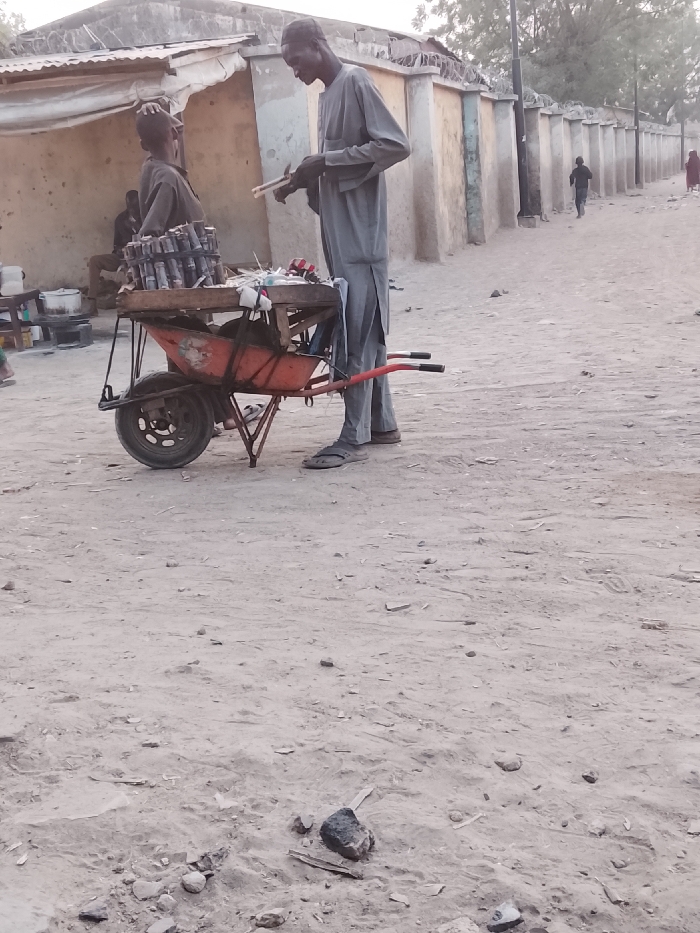 Two men stand on a dusty road, one tall, the other shorter. The taller man, dressed in a grey robe, holds small objects. Both are near a rusty orange wheelbarrow overflowing with canned drinks and items. In the background, there is a fence, buildings, and a person walking away. The ground is arid and uneven, with scattered rocks and debris.