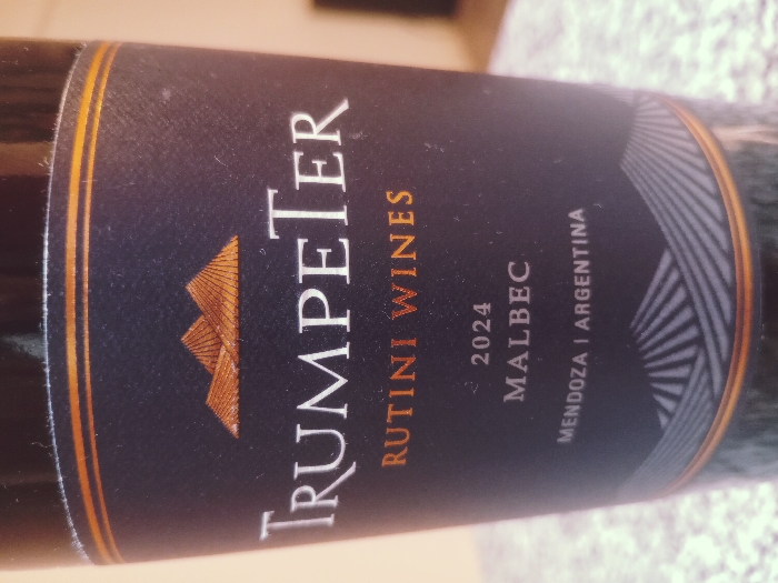 The scene is located in Lomas de Zamora, Argentina. A dark-bodied wine bottle is depicted in a close-up, front-facing perspective, resting on a light-colored, speckled surface. The bottle features a black rectangular label. The label's upper perimeter displays two thin, horizontal orange lines. Centrally positioned below these lines is an emblem composed of three interconnected, stylized orange triangular forms. The brand name "TRUMPeTeR" is printed in white capital letters. Directly beneath this, "RUTINI WINES" is inscribed in smaller orange capital letters. The vintage year "2024" appears in white, followed by the varietal "MALBEC" in white capital letters. The geographic origin "MENDOZA | ARGENTINA" is stated in white capital letters. The lower section of the label presents a graphic of radiating white lines, representing a vineyard, positioned above two additional thin, horizontal orange lines marking the label's lower perimeter. The background behind the bottle is out of focus, showing indistinct light and dark tonal areas. No individuals or active interactions are present.