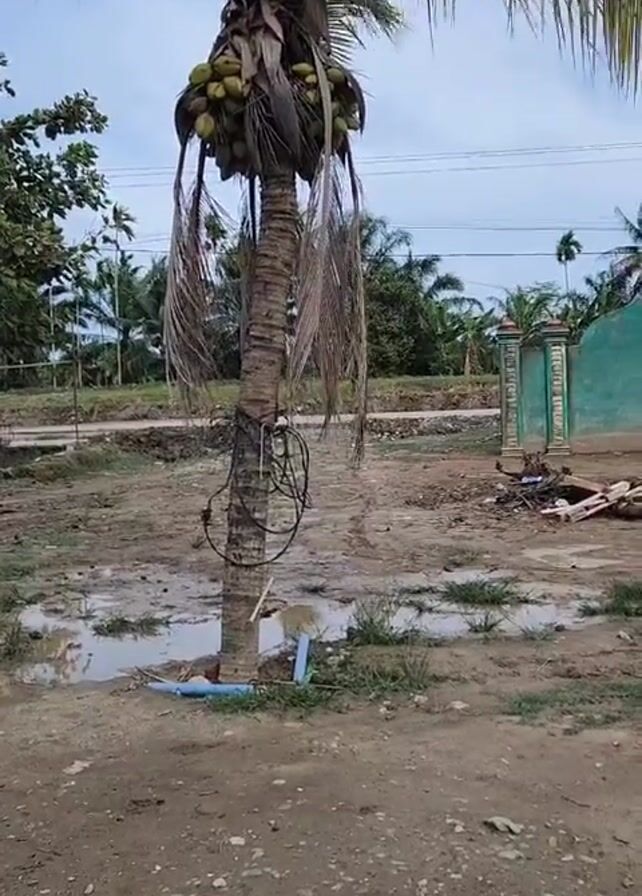 lone coconut tree standing in a muddy, post-construction area. The tree is laden with coconuts at its crown. Some dead fronds hang down from the tree. A black cable is wrapped around the base of the tree trunk, and a short, blue plastic pipe is partially exposed in the ground near the base. In the background, other trees and a light blue building with a green-trimmed fence are visible. Power lines stretch across the sky. The ground is wet and muddy, with small puddles of water. There's construction debris and random objects strewn around. There are no people visible in the video.