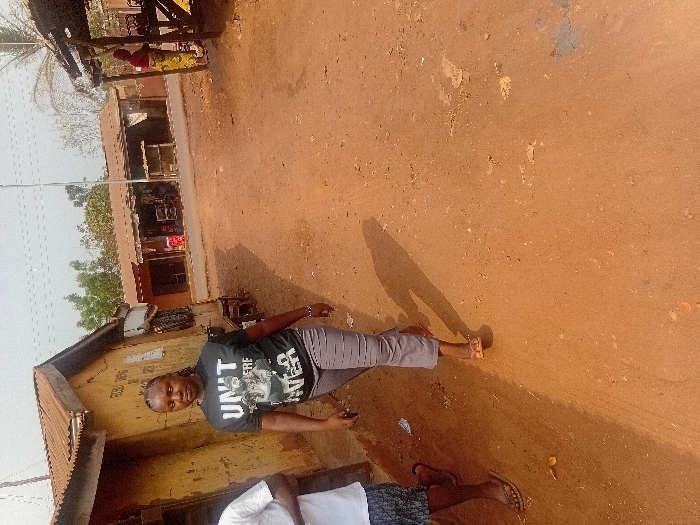 The image depicts a daytime scene on an unpaved, reddish-brown dirt road in Tuaniako, Nigeria
