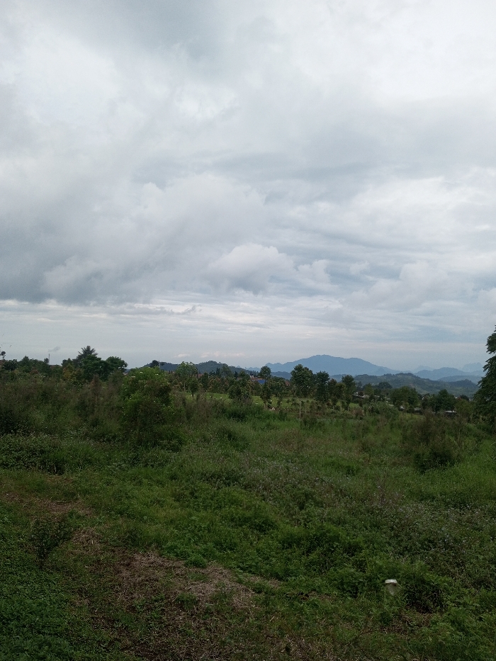 The image depicts an expansive outdoor landscape in Abbireddygudem, India, under a heavily overcast sky. The sky occupies the upper half, filled with diffuse, layered grey clouds. The foreground consists of dense, uncultivated green vegetation, predominantly grasses and various small plants. A faint, unpaved strip of ground is visible in the lower left portion of the foreground. A small, white, cylindrical object is partially obscured by foliage in the lower right. The midground features a mixture of trees and shrubs, some appearing cultivated, interspersed with open grassy areas. Distant buildings with visible rooftops are discernible among the trees, primarily towards the left and center-left, along with several slender, dark vertical structures resembling utility poles. The background is dominated by a chain of bluish-grey hills or mountains extending across the horizon, indicating a rugged terrain. No individuals or active interactions are present in the scene.
