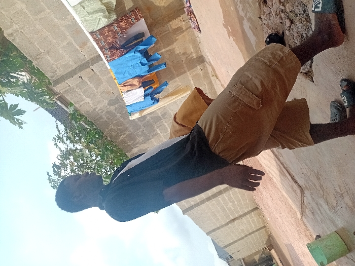 A single individual stands outdoors in the city of Unknown, Unknown, under a bright sky with sparse cloud cover. The subject is a male, depicted from a low angle, facing right. He wears a black short-sleeved collared shirt over a white undershirt, tan/khaki cargo shorts, a dark grey/black Croc on his left foot, and a black slide sandal on his right foot. An orange/brown cloth is draped over his left shoulder and arm. His right hand hangs relaxed at his side. The environment features light brown/grey concrete block walls forming a perimeter in the background and extending along the left. Above the distant wall, green leafy vegetation is visible. A white clothesline is strung between two points on the rightmost wall, displaying various garments drying, including multiple blue shirts, white shirts, a patterned brown and black item, and a light green garment. The ground consists of a mixture of grey concrete pavement and reddish-brown dirt/sand. A light green plastic bucket is positioned on the concrete in the lower-left foreground, and a small pile of dirt or rubble is present near the subject's right foot.