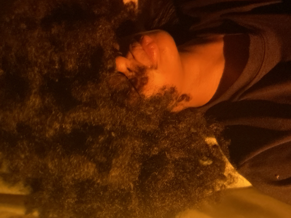 - "A person with an afro lies on their side, face pressed into their hair" by FM-kZZ752, licensed under CC BY 4.0
