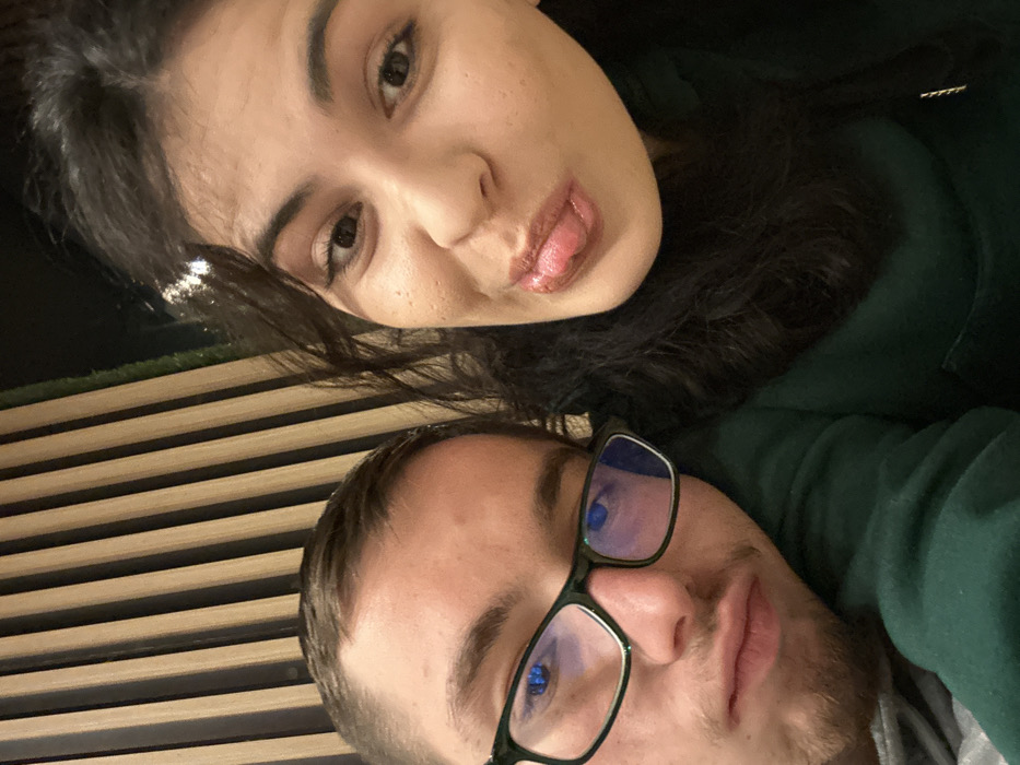 The image depicts two individuals, a male and a female, in a close-up indoor portrait. The male, positioned on the left, has short brown hair, light skin, and wears dark-framed eyeglasses with blue light reflections. He has light facial hair and exhibits a neutral expression with slightly pouted lips, wearing a light-colored top. The female, positioned to the right and slightly behind the male, has long dark hair, light skin, and dark eyes. She wears a dark green hoodie and displays a playful expression with her tongue slightly extended and one cheek slightly puffed. Small, reflective accessories are visible in her hair above her right ear. The background features a wall composed of vertical light brown wooden slats. A section of green artificial turf is visible in the upper right quadrant. The image contains no identifiable landmarks or unique architectural elements to determine a specific location within Pazardzhik, Bulgaria; the setting appears to be a generic indoor establishment.