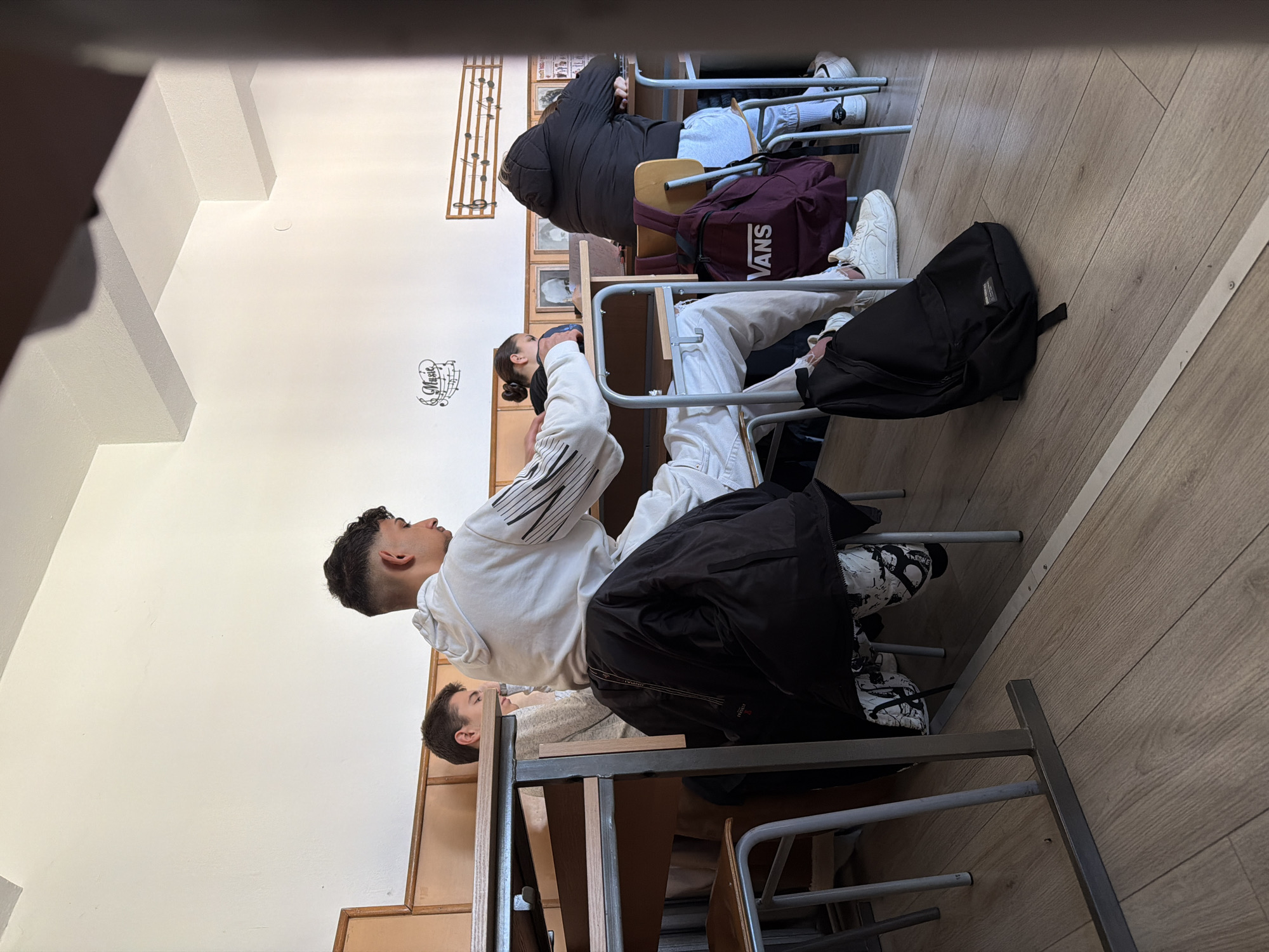 n indoor scene, likely a classroom, in Panagyurishte, Bulgaria. Three students are seated at desks. The student in the foreground is wearing a white hoodie and patterned pants with a black jacket draped over the chair. The second student is wearing a white hoodie and white pants. There is a black backpack next to them. A third student is wearing a black jacket and light-colored pants. A Vans backpack is on the floor next to them. The desks are metal framed with wooden components. The floor is a light brown wood grain. The walls are white with framed images and musical score decorations.