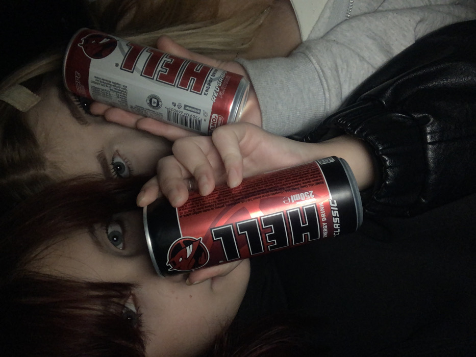 The image displays a close-up portrait of two individuals, predominantly showing their upper bodies and faces. The setting is dark and indistinct, providing no discernible environmental details or specific geographical location within Budva, Montenegro, or elsewhere. On the left, an individual with dark reddish-brown hair, partially covering their forehead, holds a red and black "HELL ENERGY DRINK CLASSIC" can, 250ml. Their left eye, with a light blue or grey iris, is visible, directed towards the viewer. They wear a black garment. On the right, a second individual with blonde hair, secured by a light-colored hair clip, holds a white, red, and black "HELL ENERGY DRINK RED GRAPE FLAVOR" can, 250ml. Their right eye, also with a light blue or grey iris, is visible and directed towards the viewer. They wear a light grey high-neck garment. Both individuals' faces are partially obscured by the energy drink cans, which they hold prominently with their hands. Their fingers are visible gripping the cans. The composition suggests a selfie or a close-up photograph taken in low light conditions.