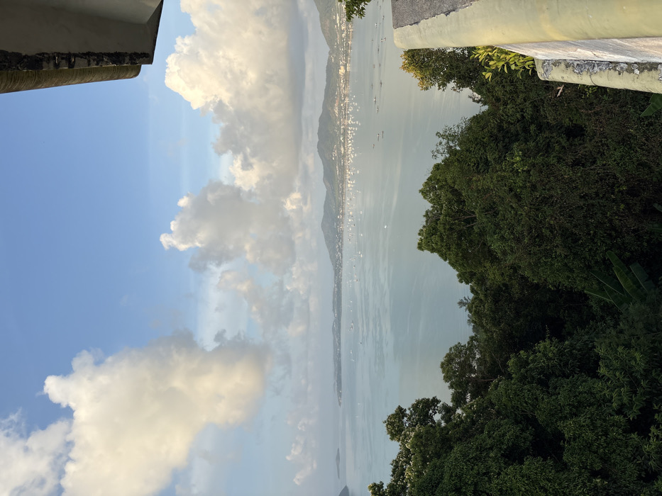 The image depicts an elevated panoramic view of a coastal bay in Wichit, Thailand. The upper portion of the frame displays a clear blue sky interspersed with scattered, distinct white cumulus clouds. Below, a calm, light blue-green body of water extends across the middle ground, populated by numerous white-hulled vessels, predominantly yachts or sailboats, anchored or moored throughout the bay. Distant landmasses, characterized by undulating hills and mountains, line the far horizon, with a discernible urbanized coastline featuring buildings. The foreground and lower middle ground are dominated by dense, dark green tropical foliage. The upper right quadrant of the image is partially obscured by a concrete architectural element, exhibiting a weathered yellow-painted top edge and a rough gray underside. No individuals or specific actions are discernible within the scene.