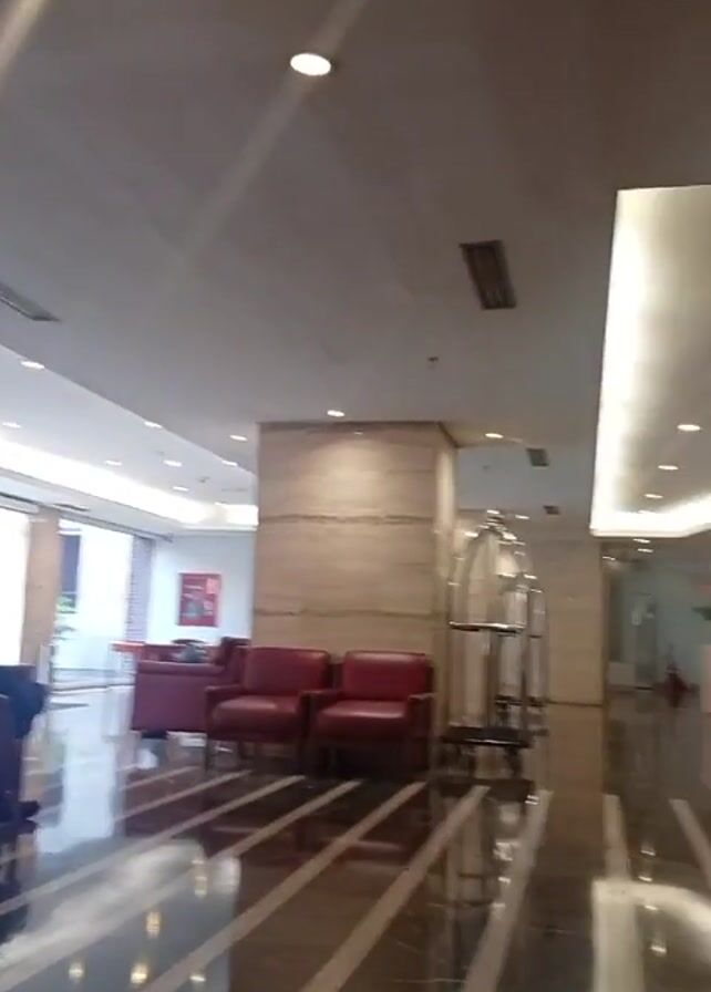The video captures a scene within a well-lit hotel lobby featuring polished marble floors that reflect the overhead lighting
