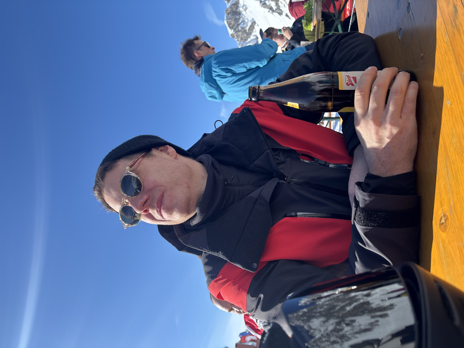A male individual is seated outdoors at a wooden table under a clear blue sky in Klösterle, Austria. He wears a black beanie, clear-framed circular sunglasses reflecting snow, a black neck gaiter, and a red and black ski jacket. His right hand holds an open brown glass bottle with a "Stiegl" label, resting on the wooden table. His left forearm is also on the table. He is looking upwards and to his left, with a neutral expression. In the midground, another male in a bright blue jacket stands with his back partially to the camera. Further in the background, snow-capped mountains are visible. Other individuals are partially visible at adjacent tables. A black, reflective object, possibly a ski helmet or visor, is on the table in the left foreground. The scene is brightly lit by sunlight.