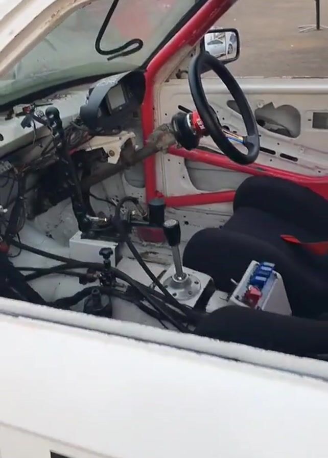 interior of a racing car. The car is white with a red roll cage. The seats are black, and there's a steering wheel, gear shift, and electronic dashboard. The back of the car contains a fuel cell and fuel pumps. The words "Meri School" and "Shaw School" are printed on the side of the car. A person in white shorts is standing near the car.