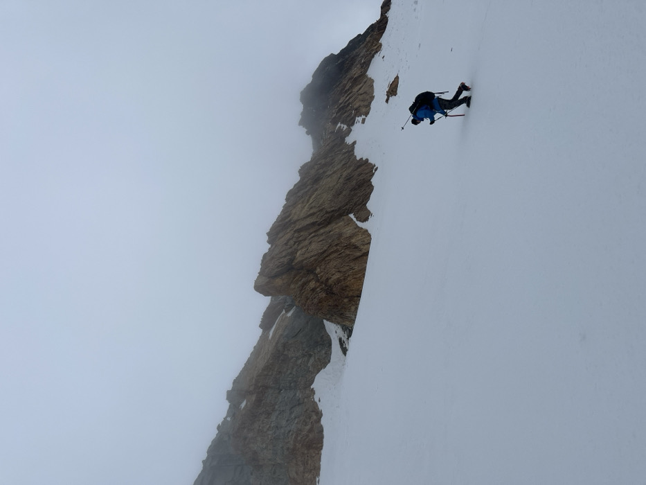 A lone skier in blue glides across a snow-covered slope, their figure dwarfed by the vast expanse of white. Adjacent to the slope, a rugged, rocky ridge rises, partially obscured by mist or clouds. The steep incline and misty atmosphere create a sense of isolation and scale.