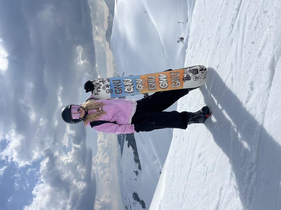 A single female individual stands on a snow-covered mountain slope in Katun Bačko brdo, Montenegro. She is centrally positioned, facing slightly to the viewer's right. The individual wears a black helmet, pink mirrored goggles, a light pink hooded sweatshirt, a black backpack, black gloves, black baggy snow pants, and black snowboarding boots. Her blonde hair is visible beneath the helmet. She holds a snowboard vertically with her left gloved hand, the tail resting on the snow. The snowboard features a multi-colored graphic design (blue, orange, white, black) with prominent "GNU" branding and various black-and-white cartoon imagery on its lower section. The environment consists of vast, undulating snow-covered terrain, extending to distant snow-capped mountains. Sparse dark vegetation is visible on some distant slopes. In the mid-ground to the right, a ski lift or chairlift structure can be seen. The sky above is partly cloudy with patches of blue. The ground snow shows subtle texture, and a distinct shadow is cast by the individual to the lower left.