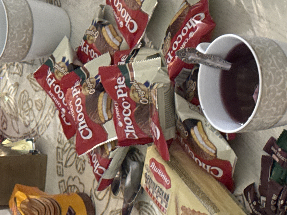 The scene depicts a tabletop in Armavir, Russia, covered by a light-colored tablecloth featuring a repeating, ornate, light-toned pattern. The table is laden with snack items and beverages. Numerous individually wrapped "Orion Choco-Pie Original" snack cakes, distinguishable by their red and white packaging, are scattered and loosely piled across the central and right portions of the table. A large, rectangular package of "ШИШКИНСКИЕ" (Shishkinskie) biscuits, with a yellow-beige wrapper, occupies the lower-left quadrant. An orange, cylindrical container is partially visible in the upper-left corner. In the lower-right foreground, a patterned ceramic mug contains a dark red liquid, with a small, decorative metal spoon resting inside. A second, similar patterned ceramic mug is partially visible in the upper-right background. Several small, individually wrapped dark candies or sachets are scattered in the lower-left foreground. A plain metal spoon rests on the tablecloth near the center-left. No individuals or active interactions are visible.