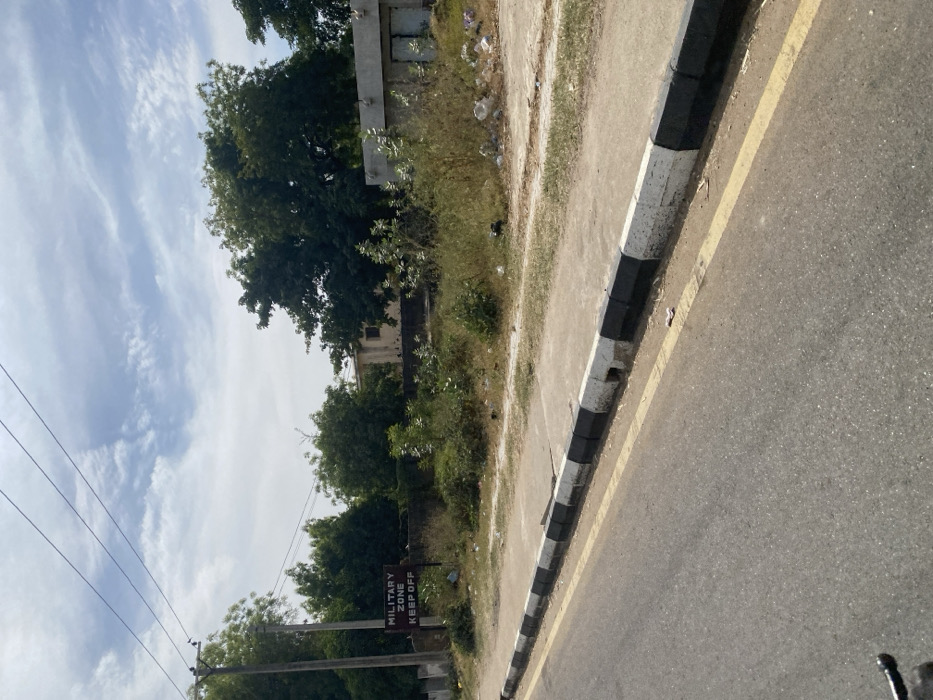 An outdoor, eye-level photograph depicts a roadside scene in Aviation Quarters, Nigeria, under a cloudy daytime sky. In the foreground, a paved asphalt road features a faded yellow line running parallel to a concrete curb. The curb is painted with alternating black and white sections, showing signs of wear, dirt accumulation, and minor chipping. Beyond the curb, an unpaved, overgrown verge slopes slightly upward. This area contains sparse grass, weeds, and larger green shrubs, with visible litter including plastic bags and other debris scattered across the ground. On the left side of the frame, within this verge, a dark rectangular sign mounted on a pole displays the white capitalized text: "MILITARY ZONE KEEP OFF." Further back, a dense line of green trees and bushes forms a natural barrier. Partially visible through and above this vegetation are sections of at least two light-colored buildings. One structure, to the left, is light beige with a flat roof. To its right, another section of a building, or a separate structure, has a flat concrete roof on which several small, dark objects are perched, possibly birds. This structure features dark rectangular openings. Overhead, multiple black utility lines traverse the sky in the upper left quadrant, originating from a pole partially obscured by foliage. The sky is largely covered with thin, wispy white clouds against a lighter blue background. No individuals or active interactions are present in the scene.
