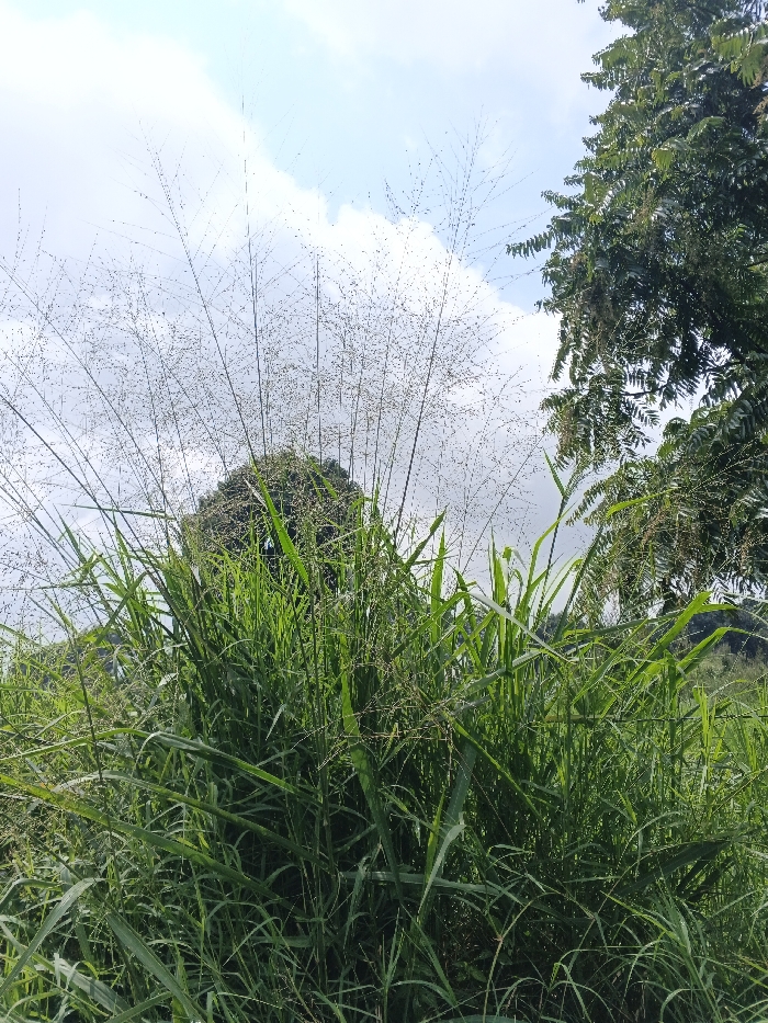 The scene depicts a dense natural landscape in Nam Sa Lat, Myanmar, under a partly cloudy sky. The foreground is occupied by a profusion of tall, vibrant green grasses with long, narrow leaves. Numerous delicate, fine-stemmed seed heads, light in color, extend upwards from these grasses, filling much of the mid-upper frame. Behind the immediate grass, a darker green, rounded mass of foliage is partially visible. To the far right, a section of a larger tree with dark green, pinnate leaves is present. The upper portion of the image reveals a sky with scattered white cumulus clouds against a pale blue background. No individuals, animals, or man-made structures are visible.