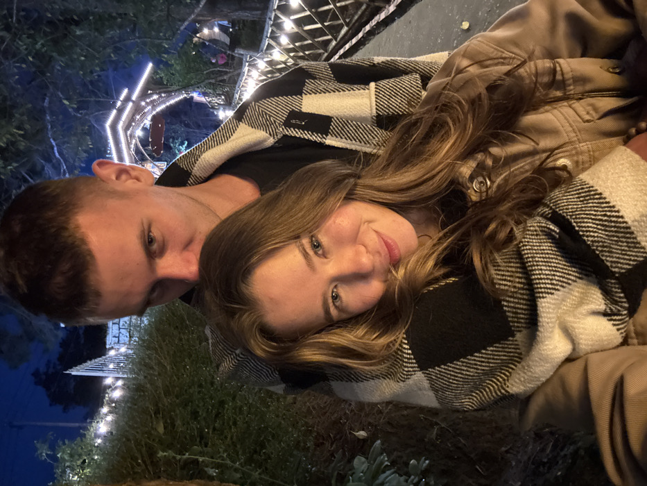 The image captures a nighttime scene in Thành phố Đà Lạt, Vietnam, featuring two young individuals in a close, intimate pose. In the foreground, a female with long, wavy brown hair, light-colored eyes, and a faint smile looks directly at the camera. She wears a light brown or tan collared jacket. A black and white plaid garment is draped over her left shoulder and arm, extending over her lap. Behind her, a male with short brown hair and a dark shirt is positioned, his head resting near the top of the female's head. He looks towards the camera over her right shoulder. His left arm is wrapped around her, and he is also wearing or sharing a black and white plaid jacket. The background is dark, illuminated by numerous white string lights decorating a wooden archway structure and a railing on what appears to be an elevated pathway or bridge. Dark foliage and trees are visible on the left and in the deeper background.