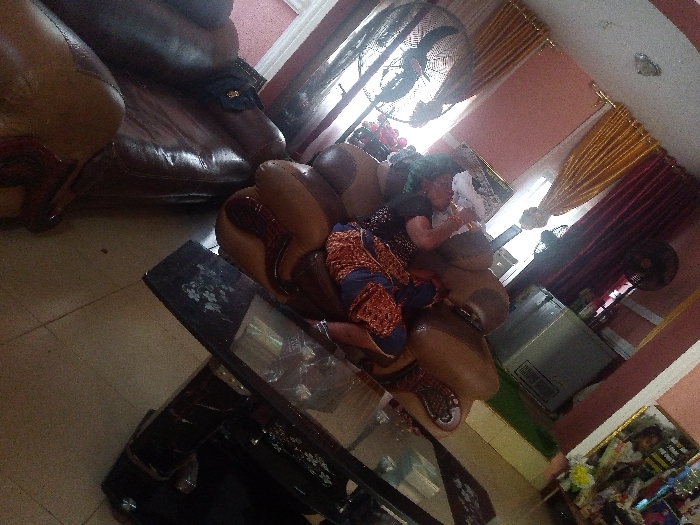 An interior room, likely a living area, is depicted in an angled, slightly low-perspective shot. One individual, appearing to be an adult of dark complexion, is seated on a multi-cushioned, light-brown upholstered sofa. The person wears a dark short-sleeved top, patterned fabric bottoms in shades of orange, blue, and brown, and a green head covering. They are holding a white object with both hands near their mouth, suggesting consumption or examination. In the background, a dark brown leather sofa is partially visible, with a small black bag resting on its armrest. A dark-colored coffee table with a glass top and white floral or vine patterns is in the foreground, displaying a clear plastic wrapper or similar item. The room features light reddish-pink walls and a light-tiled floor. Two windows are present; one on the left has sheer curtains and a black oscillating fan in front of it, while another on the right has gathered gold and maroon curtains. A silver-colored refrigerator and a second black oscillating fan are visible. A ceiling fan with dark blades and a small light fixture are mounted on the ceiling. A framed item and a small arrangement of artificial yellow flowers are on a surface to the far right. Location: Unknown, Unknown.