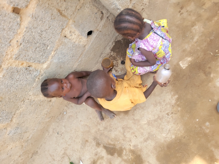 The image portrays three young children outdoors in Sabojibi, Nigeria