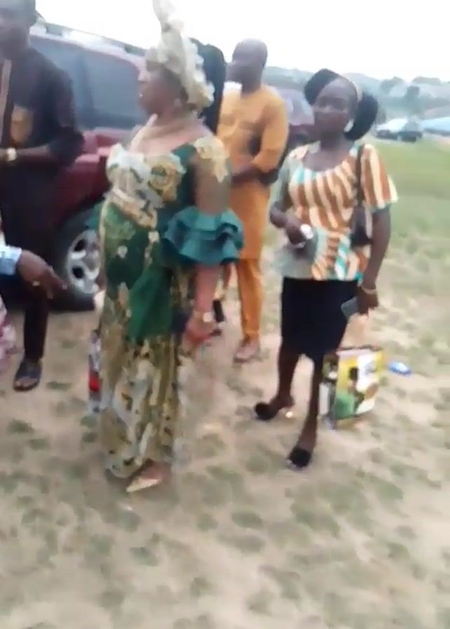 group of people outdoors, likely at an event. There are four adults visible, two women wearing elaborate dresses and headwraps, and two men in casual attire. A young girl in a floral dress is also present. They are standing on a grassy area near a maroon SUV. The people seem to be talking and interacting with each other. There is a small box on the ground near one of the women. The background shows a somewhat blurry landscape with a few other cars and buildings visible in the distance. The overall lighting suggests it's either an overcast day or early evening.