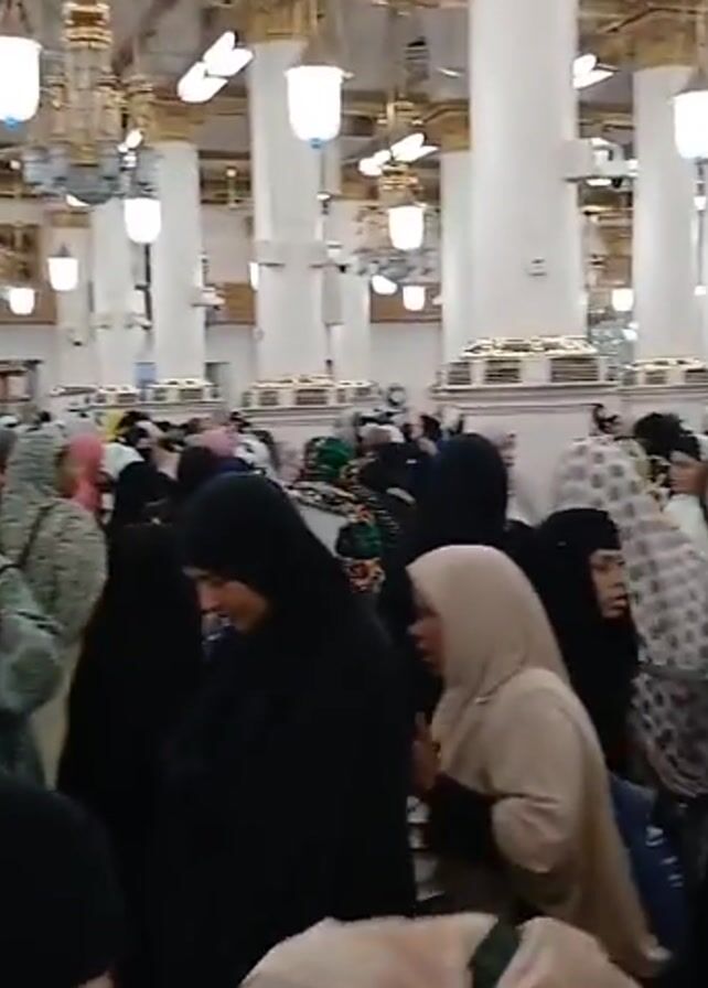 large group of women inside a large mosque, possibly Masjid al-Nabawi