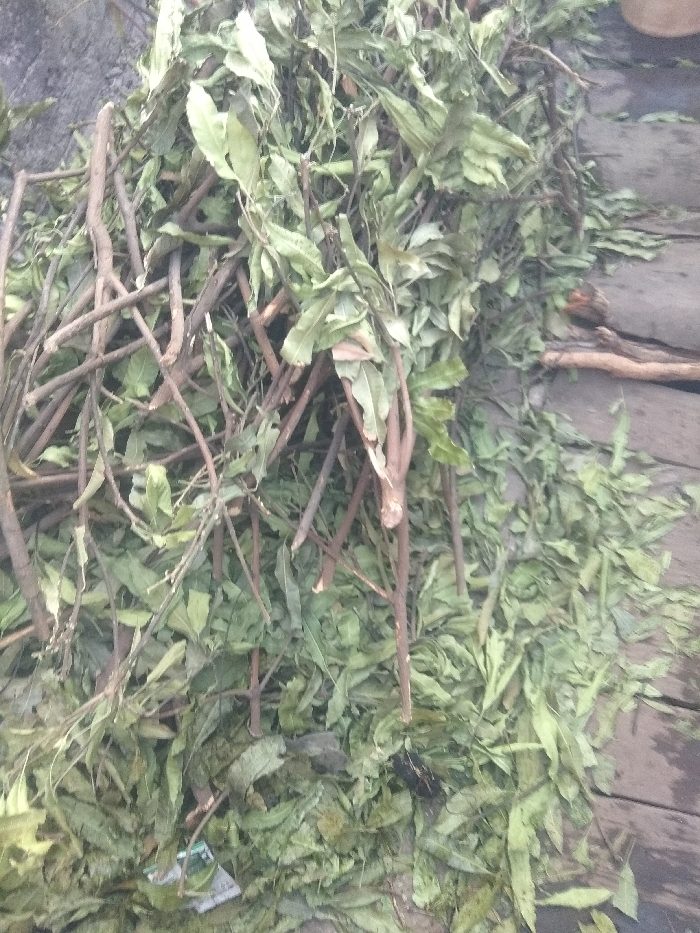 A pile of cut branches and leaves covers a weathered, planked surface. The branches are mostly bare with remnants of their original green leaves clinging to them. The leaves, detached and scattered around, have a slightly wilted appearance. The overall texture suggests a recent trimming or clearing of vegetation.