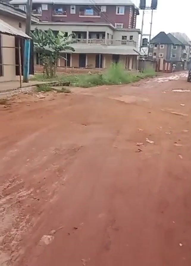 The video presents a static shot of a dirt road within a built environment. The road itself is a reddish-brown hue and appears uneven and slightly muddy in sections, scattered with debris like paper. Buildings of various sizes and designs border the road. One prominent building is a two-story structure painted in shades of white and maroon, with a visible balcony and a series of closed openings on the ground floor. Another building nearby has a brown roof. Utility poles with water tanks are visible in the backdrop. A vehicle, possibly a van or small truck, is parked further down the road, seemingly facing the camera. Vegetation, including patches of green grass and a banana plant, are present near the buildings. The overall environment suggests a residential area with unpaved roads and mixed architectural styles.
