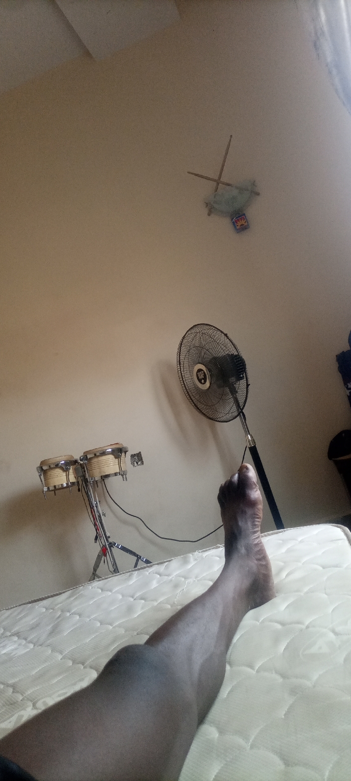 The image displays an interior room in Howayi, Nigeria. The immediate foreground features a dark-skinned individual's right lower leg and foot, extended and resting horizontally on a white, quilted mattress that occupies the lower half of the frame. To the left, a set of two bongos on a chrome stand is positioned against a light-colored wall, featuring light-toned drumheads and wooden shells. A black electrical cable extends from the area near the bongos towards the right. A black pedestal fan, with a "WARP" brand logo visible on its center, stands on the right side of the frame. Above the fan, two light-colored drumsticks are mounted on the wall in a crossed pattern, adjacent to a small, light blue object resembling a helicopter model with an attached box. The room's walls are a uniform light beige or off-white. The upper left corner reveals a portion of the ceiling with subtle architectural detailing. A dark object, possibly a bag, is partially visible in the extreme right background.