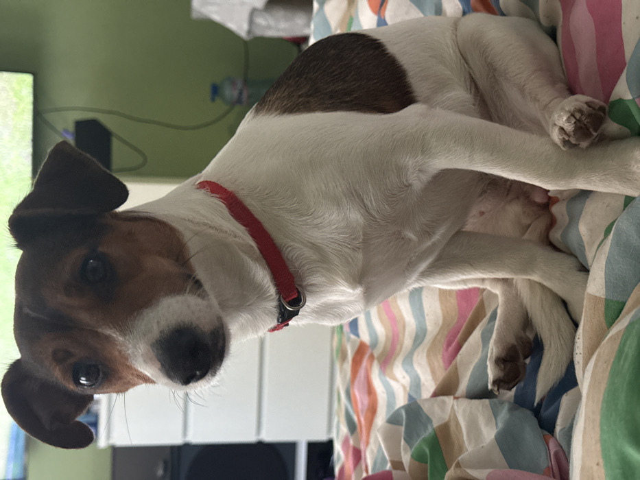 - "A Jack Russell Terrier-type dog is seated upright on multi-colored striped bedding within an indoor residential setting in Popovo, Bulgaria" by FM-IF0662, licensed under CC BY 4.0