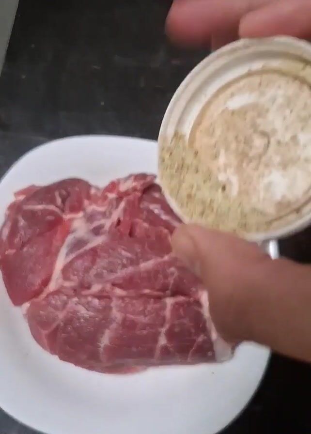 Here's a brief description of the video: A raw cut of meat rests on a white, square plate on a black countertop. A hand holds a small, round container with a white lid and shakes a mixture of spices onto the meat. A bag of salt is visible in the background.