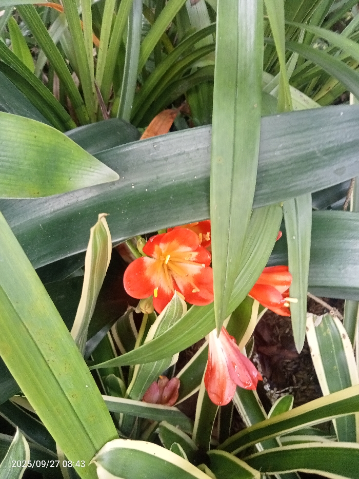 The image displays a close-up perspective of flowering plants, consistent with the Clivia miniata species, located in Isiolo east, Kenya. The scene is dominated by dense green foliage, with multiple long, strap-like leaves. Several leaves in the foreground and lower mid-ground exhibit distinctive cream-and-green variegation. Three primary floral elements are visible: a prominent, partially open flower with bright orange-red petals transitioning to a cream-yellow center and yellow stamens, situated slightly above the image center-left. To its right, a second flower, appearing as a closed or partially unfurled bud, points downwards, displaying similar orange-red coloration. A third, smaller, reddish-pink bud is discernible in the lower-left quadrant. The plants are rooted in dark soil or mulch, with scattered dried brown leaves visible amidst the green growth. No individuals are present. A digital timestamp '2025/09/27 08:43' is imprinted on the lower-left.