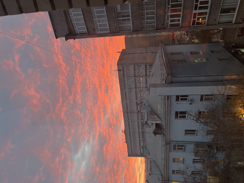 The image depicts an urban twilight scene in Krasnoyarsk, Russia. The sky, occupying the upper two-thirds of the frame, is filled with widespread altocumulus clouds intensely illuminated in shades of fiery orange, red, and pink by the low sun, transitioning to a pale grey-blue at the zenith. In the mid-ground, a prominent light-blue, four-to-five-story residential building stands centrally, featuring a grey hipped roof with multiple dormer windows, numerous rectangular windows with white frames (some showing interior light), a small enclosed balcony on the left side, and several exterior air conditioning units. A satellite dish is affixed to its roof. Bare tree branches partially obscure its lower facade, and artificial light emanates from a ground-level window. Behind this, a long, multi-story grey structure, likely an administrative or academic building, spans the background with uniformly arranged windows and rooftop antennae. To the immediate right, partially cropped, is a multi-story building constructed of light-colored brick with white-framed windows, reflecting the red sky and showing some interior illumination, including a sheer curtain in a lower window. Multiple overhead power and communication lines traverse the sky between the structures. Faint mountain outlines are visible on the distant horizon to the far left. The scene is devoid of visible human activity. The specific location is an urban residential and administrative area within Krasnoyarsk.