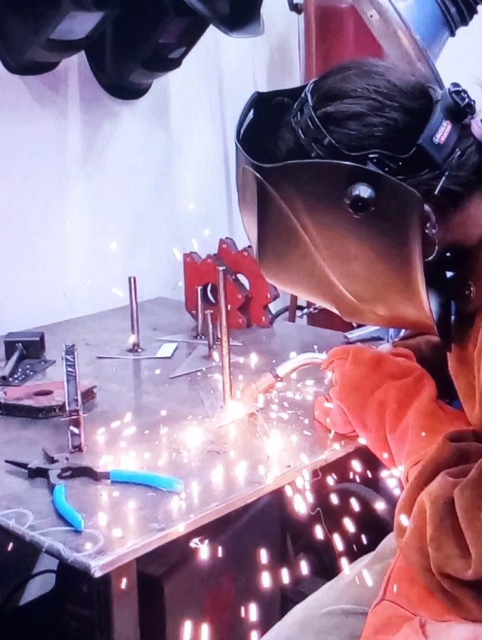 The image depicts an individual actively engaged in welding at a metal workbench within an indoor workshop environment