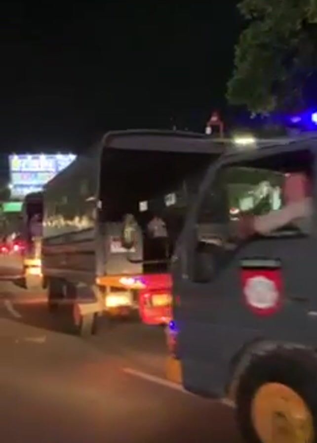 At night, the camera follows several dark gray trucks driving along a dark road with light-colored lane markers. The trucks, identified by yellow text on the side as POLISI, are filled with people wearing hats. Streetlights and electronic billboards are visible in the background. Other traffic, including pedestrians and motorcycles, is visible on the road.