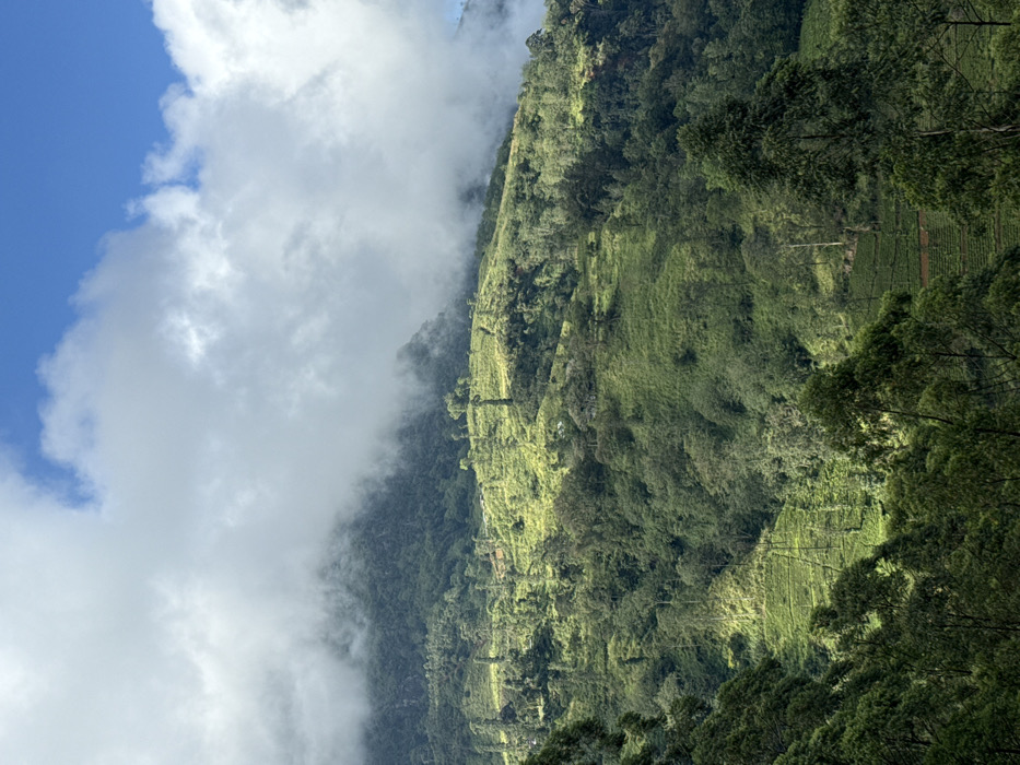 A verdant mountain slope is partially shrouded in mist and clouds. The lower regions boast dense foliage, transitioning into open grassy areas higher up, hinting at possible terraced cultivation. Light streams through the clouds, highlighting sections of the landscape. The sky is partially visible on the left, showing a bright blue hue contrasting with the white clouds.