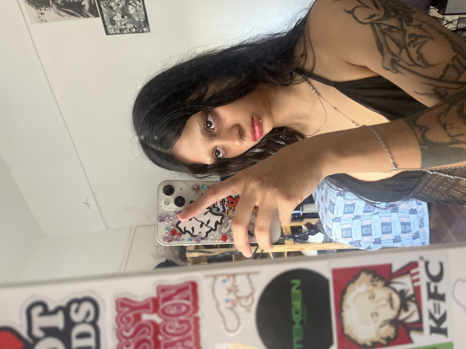 A selfie is taken in a mirror, focusing on a woman with dark hair and noticeable eyebrow and lip piercings. Her left arm, heavily tattooed, is visible, adorned with a silver bracelet. She's wearing a black top with delicate straps. Her phone, featuring a decorated case, is held up, partially obscuring her face. The mirror frame is covered in various stickers. Behind her, a blue and white patterned object sits on a wooden shelf. Two framed black and white images hang on the wall above.