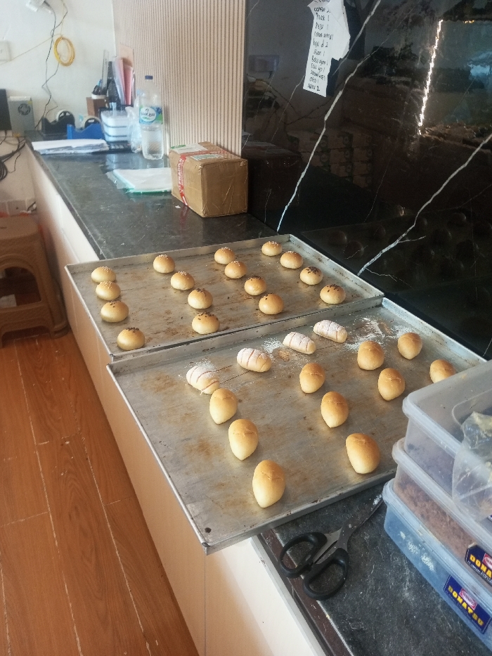 Two trays of baked goods sit on a counter. The top tray holds round buns, some topped with seeds. The bottom tray contains oval buns and rolls with a sugary glaze. A pair of scissors rests near a stack of plastic containers labeled "Donatsu". Behind the trays are a cardboard box, a bottle of water, and other items on the counter. The background includes a wall with a dark, marbled pattern and a textured wall panel. Wooden flooring is visible in the foreground.